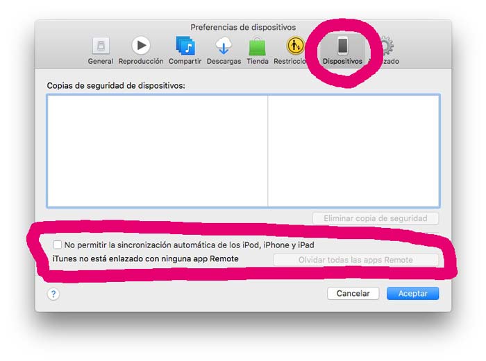 - Activa la casilla inferior en donde aparece: “No permitir la sincronización automática del iPad, iPhone, iPod”.