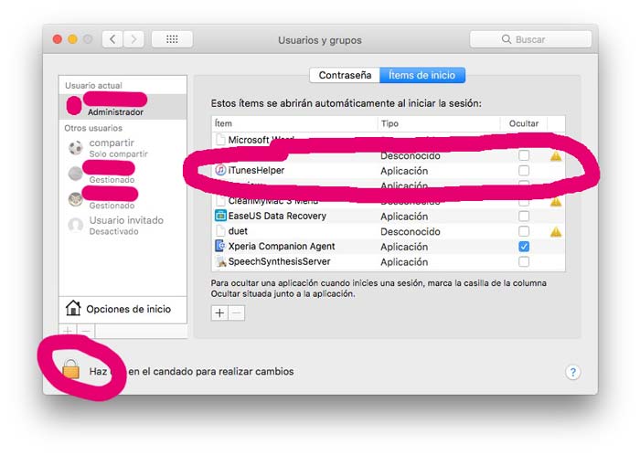 - Escoge la opción de “Usuarios y grupos” y ubícate en el inicio para eliminar la opción del iTunes.
