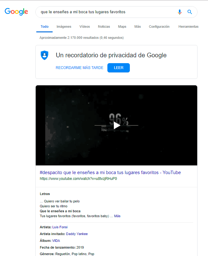 Además de reconocer la canción, te permitirá ver la letra y el vídeo.