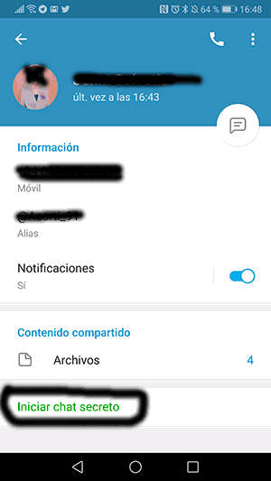 Estos son los llamados “Chats secretos”, y para iniciar uno tienes que entrar en la información de ese contacto y pulsar la opción “Iniciar chat secreto”.