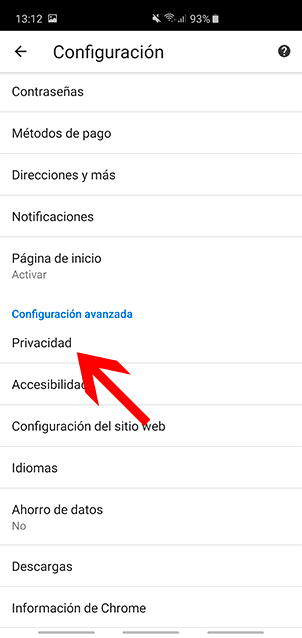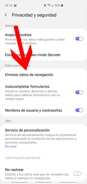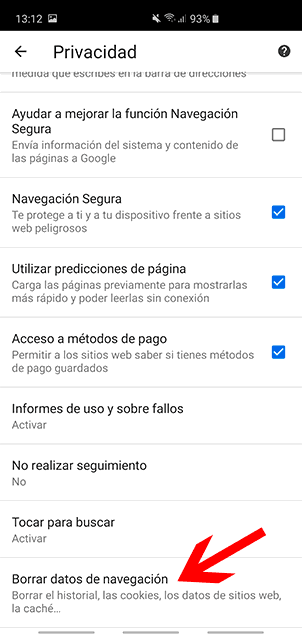 3. Elige la opción de Privacidad y seguridad. Ahora verás que puedes pulsar en Eliminar datos de navegación así que pulsa.