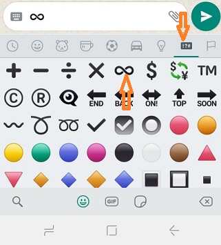 - Para utilizar el icono infinito en las conversaciones de WhatsApp debes ingresar al chat que desees y pulsar en la carita de los emojis y al abrirse la sección de estos pulsar en la el icono de los símbolos, este está representado por los símbolos de exclamación, interrogación y numeral.