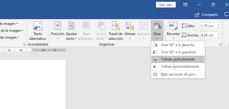 - Ve a la barra de funcionalidades de Word y escoge la opción de “Voltear verticalmente” o “Voltear horizontalmente” según sea tu caso.