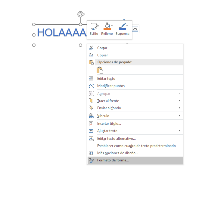 - Ahora haz clic derecho sobre el cuadro de texto y elige la opción de Formato de forma.