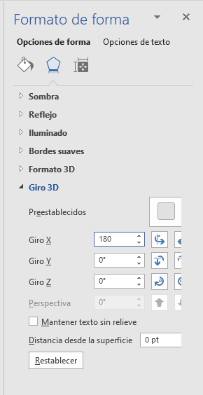- Buscar dónde dice “Giro 3D” y en el cuadro escribir “180” para que este gire a estos grados y se voltee. Luego te queda es acomodar una adyacente en otra, de manera tal que se reflejen paralelamente.