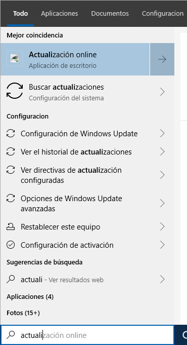 - Pulsa en el buscador de Windows 10 y escribe Actualizaciones para que salga la opción de Buscar Actualizaciones y pulsa.