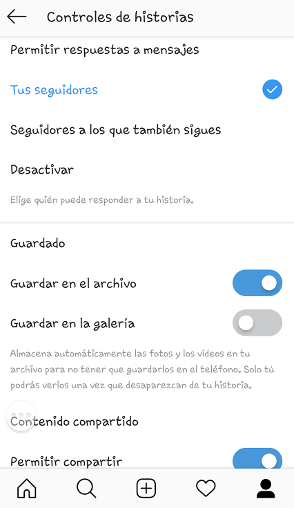 - Ahora se visualizaran todas las alternativas de configuración que conforman la opción anterior, debes presionar sobre “Controles de Historias”