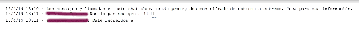 Si estas opciones no te has servido, lo mejor es que exportes la conversación en un archivo desde WhatsApp. Aquí te pongo el vídeo para que sepas como hacerlo.