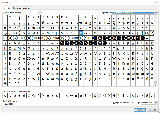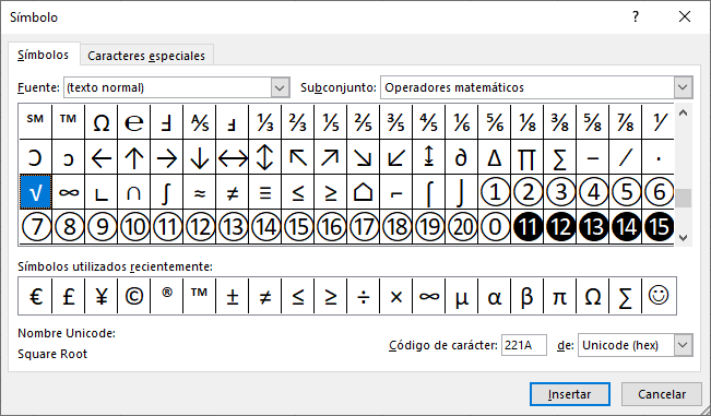 - En esta ventana elige la opción de Operadores matemáticos dentro de Subconjunto. Ahí encontrarás el símbolo de la raíz cuadrada. Pulsa en Insertar para poner ese símbolo.