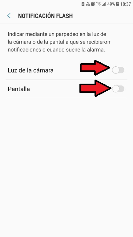 Para subsanar esto, Samsung en este caso pone a disposición del usuario la posibilidad de usar la luz del flash como luz de notificación, y no todo el mundo sabe esto pero también existe la posibilidad de hacer una especie de destello de pantalla.