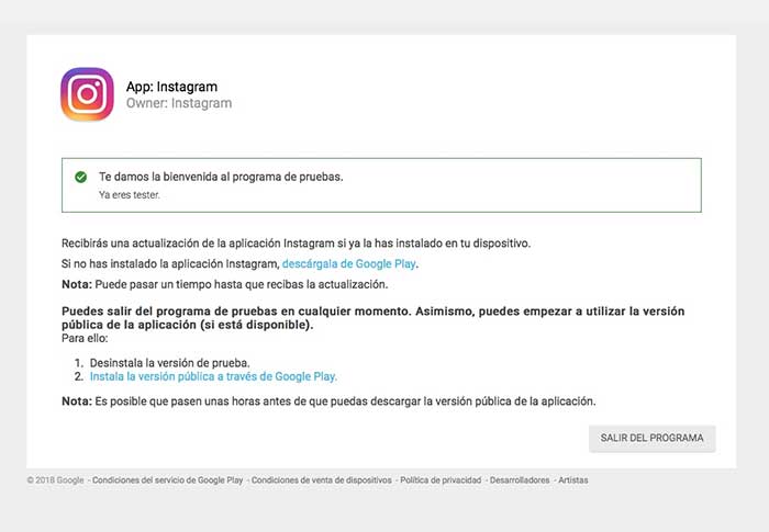 Lo siguiente que verás será un mensaje en el que se te informa de que te has convertido en tester de la app. A partir de ahora vas a recibir las actualizaciones antes que nadie y de este modo vas a poder ir probando todas las novedades que va lanzando la App.