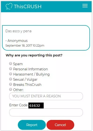 En esta plataforma todos los contenidos que son publicados tienen la responsabilidad en el autor y es que en las bases legales de thiscrush ya se han encargado de dejarlo todo bien encajado (tengamos en cuenta que la edad de los participantes es delicada). Carga la responsabilidad básicamente a los padres por no educar bien a sus hijos y decirles que no mientan en su edad o no se dediquen a herir a otros jóvenes. Lo único que permite es reportar comentarios que consideremos ofensivos o fuera de lugar.