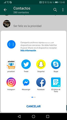 Aquí dentro, selecciona el medio por el que quieres mandar esta invitación a WhatsApp, entre las opciones encontrarás las redes sociales que utilices, el gestor de correo y también vas a ver la función de mensajes del móvil entre otras.