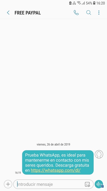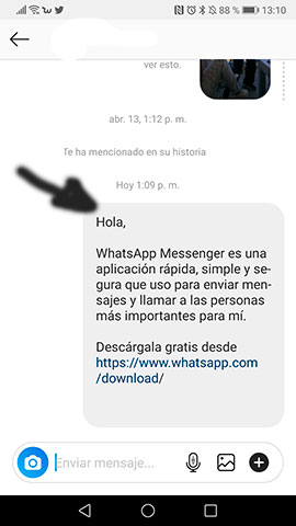 Selecciona la persona dentro de la App que eligas y pulsa en el botón “Enviar”. A mí por ejemplo me enviaron una invitación a WhatsApp por Instagram y es así como se ve. Un texto seguido de un enlace que te lleva a descargar la App.