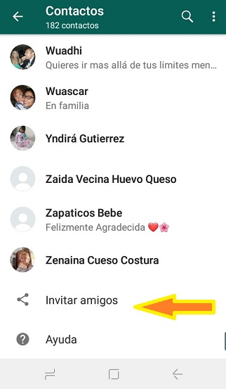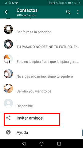 Dentro de la App de WhatsApp, entra en tus contactos, y una vez aquí pulsa en la opción de “Invitar amigos”, la cual vas a encontrar al final del listado de contactos.