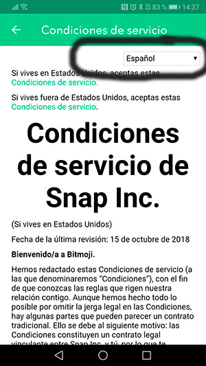 OJO! Aquí vas a cambiar el idioma a la hora de leer los términos y condiciones de la App, pero no en general en toda la App. Todos los textos largos explicativos dentro de la App de Bitmoji disponen de esta pestaña de idioma, pero para la App general ni rastro… De todos modos sirve porque aparece en los sitios donde hay más texto se puede cambiar el idioma. Lo demás es super intuitivo, porque para moverse por las pantallas hay que pulsar sobre iconos. Aún así, si quieres cambiar el idioma en la App de forma total, ya sabes cómo. Es lo que te explique primero.