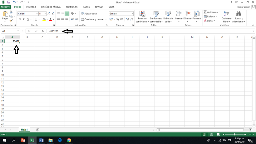 - Inicia colocando el símbolo = colocas el número luego el símbolo matemático * número y presionas enter. Debe quedar así: =89*263 enter elresultado que arrojara será 23.407,00.