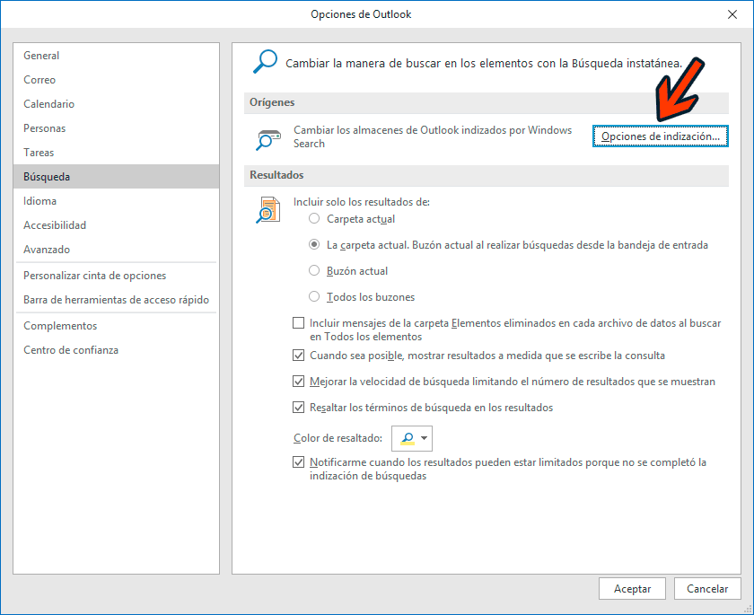 - A continuación se abrirá una ventana emergente busca y presiona “Opciones de indización”