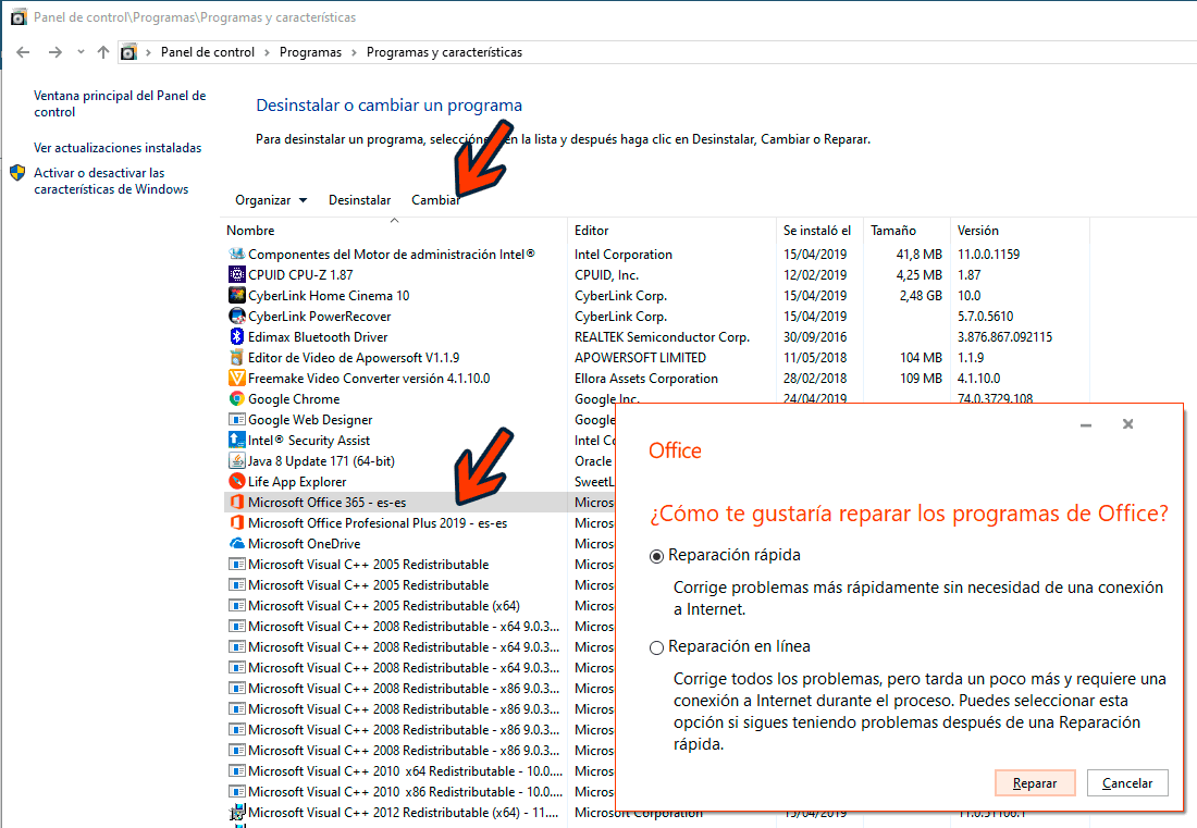 - Ahora busca la suite de Office y pulsa en Cambiar. Elige reparación rápida para que se solventen los problemas.