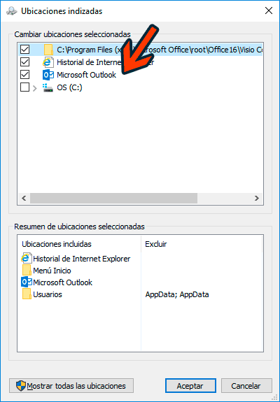 - Ahora veras un directorio donde se señalan todas las ubicaciones incluidas, en esta lista debe aparecer “Outlook” presionas allí, de no aparecer presiona en “Modificar”.