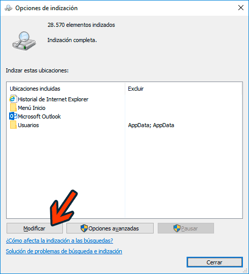 - Ahora asegúrate de que Outlook está dentro del apartado de Ubicaciones incluidas. Si no te aparece pulsa sobre Modificar.
