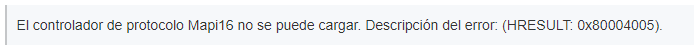 El controlador de protocolo Mapi16 no se puede cargar. Descripción del error: (HRESULT: 0x80004005).