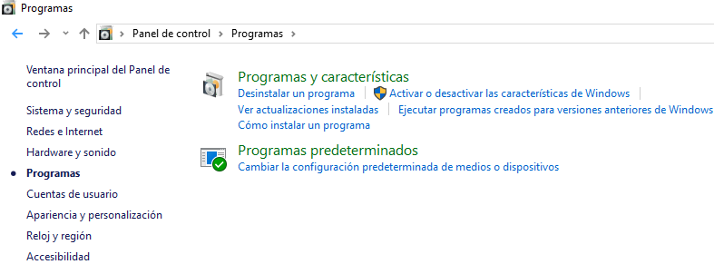 - A continuación se muestra una serie de opciones pulsa sobre “Programas y características”