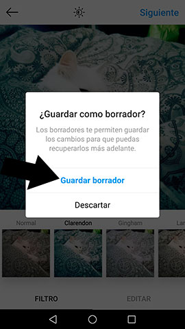 Ahora, si se tratan de filtros de fotos como los del manual en el muro de Instagram, el proceso para guardar la foto sin publicar es este: Añade los filtros a la foto y llega a la última pantalla antes de publicar, donde se le añade el pie; pero no llegas a subirla. Al dar hacia atrás aparece un mensaje en la pantalla que dice que si quieres “Guardar como borrador la foto”. Pulsa en “Guardar borrador” y guardarás la foto en la Galería de tu móvil sin subirla.