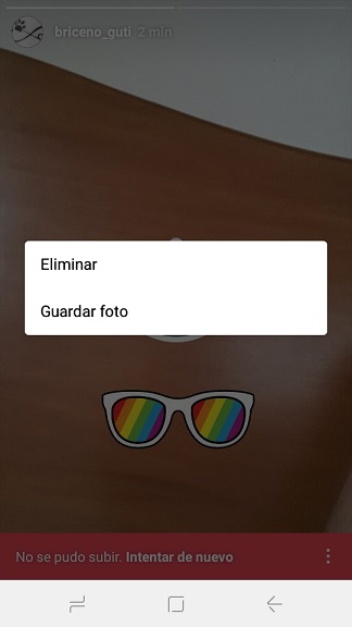 - En este momento Instagram emitirá un mensaje de advertencia en el que te indica que ha sido imposible publicar tu foto por lo que puedes, “Eliminarla” o“Guardar foto”, presionas sobre la segunda alternativa y se almacenara en tu móvil.