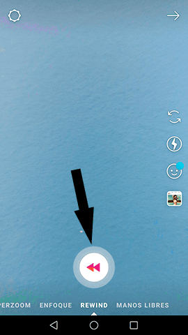 Paso 2: Al abrirse la cámara para crear historia, justo debajo del botón para tomar fotos se mostrara una barra deslizable con varias funciones deslízala hasta encontrar “Rewind”.