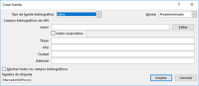 . A continuación veras una ventana emergente donde aparecen barras en blanco, allí debes escribir todo el contenido bibliográfico referente a la cita que deseas colocar, esto es desde el nombre de la fuente donde obtienes la cita, hasta el numero de página, también podrás incluir el nombre del actor, y el año de mención de la información, finalmente pulsas “Aceptar”