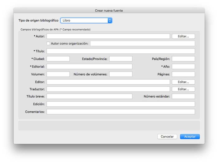 . A continuación pulsa en el apartado “Insertar bibliografía” y sencillamente colocas toda la información que deseas hasta presionar en “Aceptar”
