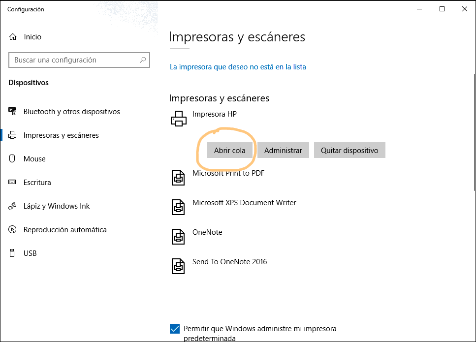 - Aquí entra en Impresoras y escáneres. Pulsa sobre tu impresora y elige Abrir cola.