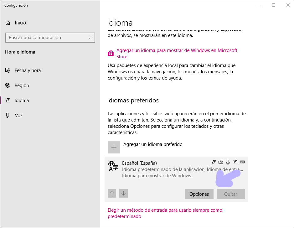- Ahora en Idiomas preferidos pulsa en el idioma que quieres configurar como predeterminado o bien agrega uno nuevo. Una vez pulses elige la opción de Opciones.