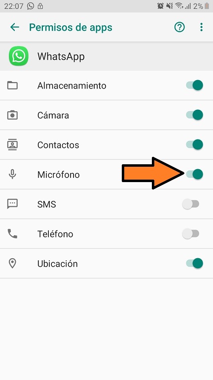 - Por último, vas a ver una lista de todos los permisos que tiene Whatsapp en tu sistema, aquí tienes que buscar la que dice “Micrófono” y desplazar la barra que se muestra en esta parte hacia la derecha para que se coloque en un color verde y por lo tanto se habilite.
