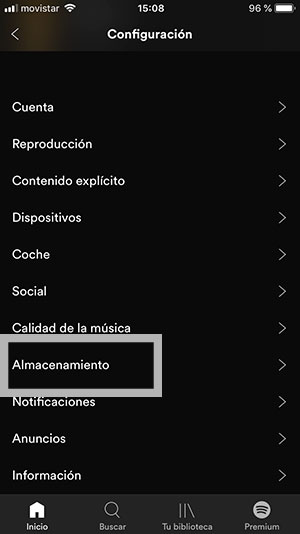 - “Ajustes”, “General, “Almacenamiento y iCloud, “Almacenamiento”, “Gestionar almacenamiento”, se muestran las aplicaciones que consumen más almacenamiento y allí siempre aparecerá Spotify, presionas “Eliminar”, luego debes instalar nuevamente las aplicación