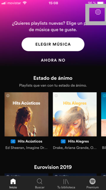 Entra en la aplicación de Spotify, y aquí dentro en la esquina superior derecha vas a ver un icono de un engranaje o rueda dentada. Pulsa aquí.