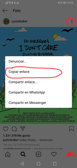 Para copiar la URL de las publicaciones de Instagram, lo mejor es que te vayas a la versión web de la app para que la puedas copiar desde la barra de direcciones.