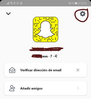 Lo primero de todo es que copies tu nombre de Snapchat. Para esto entra dentro de la app, y dentro de tu perfil, selecciona el icono de la tuerca en la esquina de arriba para entrar en los ajustes.