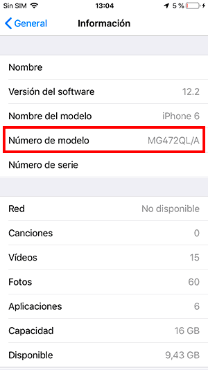 - Aquí vas a ver una de las opciones que es Número de modelo, pues aquí es donde vas a ver el MPN de tu iPhone.