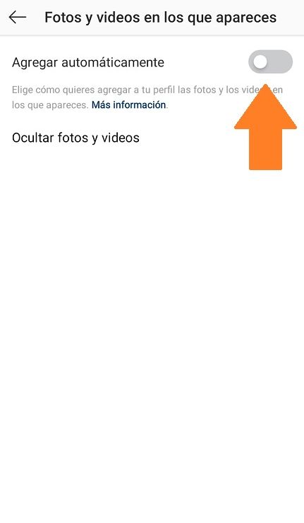 - Por ultimo en la alternativa “Agregar automáticamente” se te mostrara una barra, esta debes desplazarla hacia la izquierda para que a partir de ahora cada etiqueta que te hagan te solicite permiso para mostrarse en tu perfil o no.