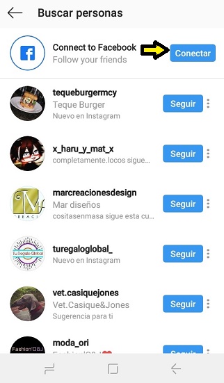 - Espera unos segundos que se ejecute el proceso de sincronización y automáticamente se mostrara una directorio con cada uno de los perfiles de Instagram de tus contactos de Facebook, presiona en seguir y podras vincular los contactos de una cuenta a otra.