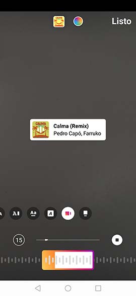 Lo primero que debes hacer es seleccionar el sticker la música. Una vez que lo haya seleccionado, tienes que escoger la canción que quieres poner. Si tocas en ellas vas a pode seleccionar el cantante o la portada del disco. No te preocupes porque no lo puedes mover. Pulsar en "listo" en la parte superior,