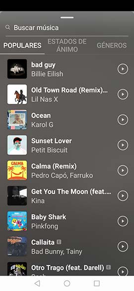 Ahora se muestra la galería de música predefinida por la misma app en donde podrás utilizar varios filtros musicales, están son: “Populares” “Estado de ánimo” “Géneros”, realiza tu selección, para escoger el stickers (caratula) de la música que estas utilizando desliza una pequeña barra que se muestra en la en el medio de la pantalla hasta encontrar un icono de un rectángulo donde debes presionar.