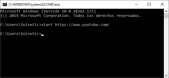 Para abrir una página de forma general usaremos el comando start y después la URL que queremos abrir. En este caso el comando con YouTube quedaría de la siguiente forma: