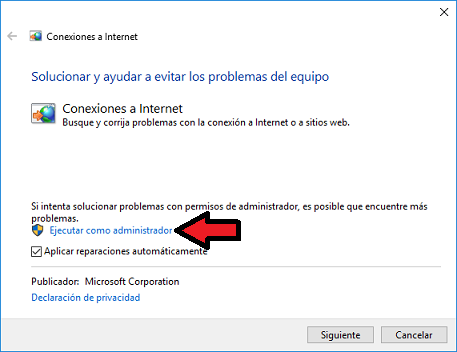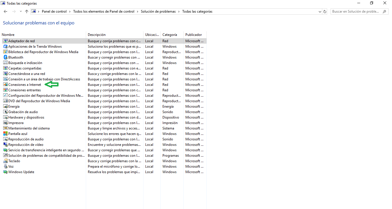 Para ver esta alternativa escribe la palabra solución en la lupa de búsqueda y al desplegarse “Conexiones a internet” escoges “Conexiones avanzadas” aquí solo debes ejecutar como administrador para resolver el problema.
