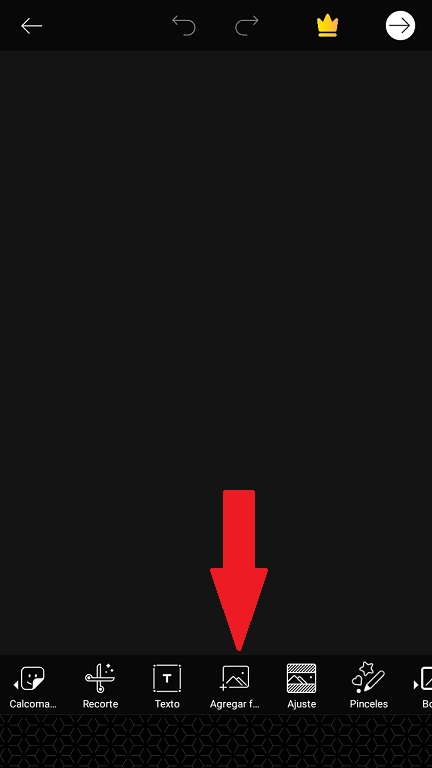 - Como veras se te abrirá el panel de edición, aquí tienes que ir a la parte de abajo y deslizar el menú de opciones a la izquierda hasta que encuentres la opción “Agregar foto”, al hacerlo presiónala.