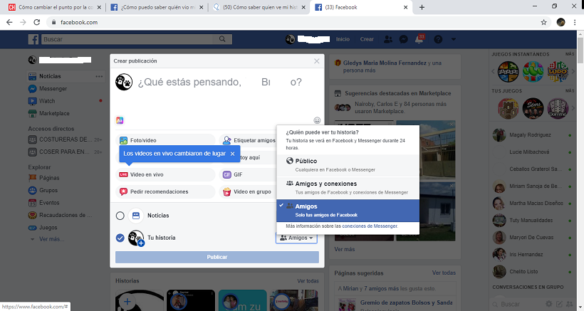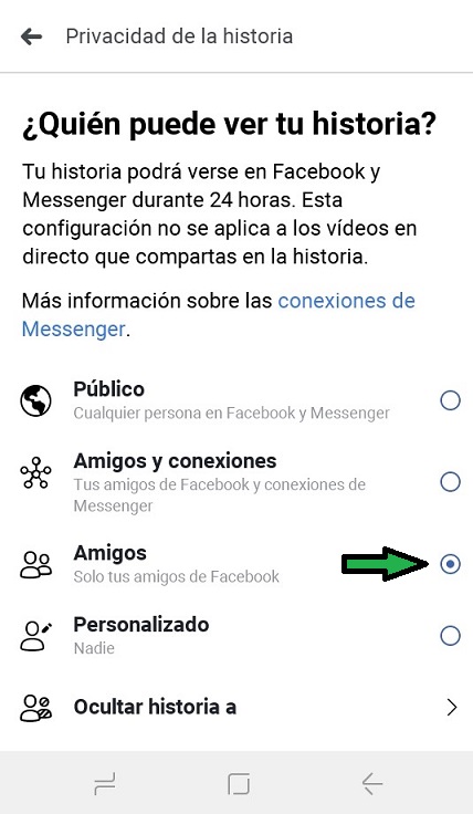 - Ahora podrás personalizar tu historia, en este caso escoge la opción “Amigos” incluso podrás seleccionar personas en específico y amigos de Messenger.