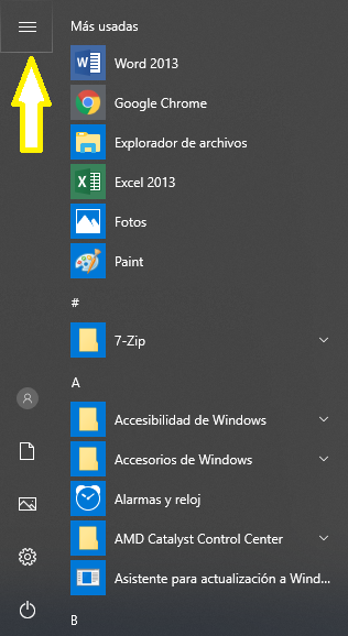 - A continuación debes esperar unos segundos y cierras la pantalla de CMD, dirígete al icono de Inicio de Windows al hacer clic se desplegara un directorio de alternativas, ve a la parte superior izquierda donde veras un icono de tres líneas horizontales pulsa allí.