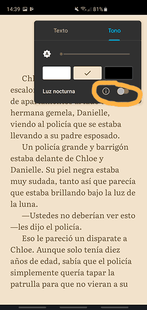 Activar la función de luz noctura es sencillo, aunque hay que reconocer que para encontrarla puede no ser muy intuitiva. A mí me ha pasado intentarla encontrar en los típicos ajustes y no he podido así que te dejo los pasos para activar y desactivar la luz nocturna dentro de la app de Play Google libros.
